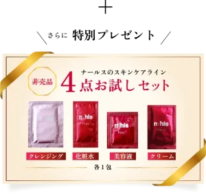 また、公式サイトでは、ナールス製品を初めて注文する方限定で、ナールスのスキンケアライン4点お試しセット(クレンジング、化粧水、美容液、クリーム各1包)もプレゼントされています。