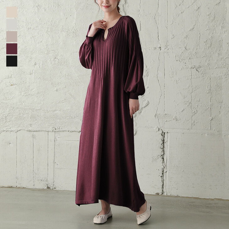 - 14 楽天1位!ニットワンピース リブニットワンピース ニット ワンピース レディース 秋冬 春 Vネック 長袖 パフスリーブ ブラック きれいめ ハイウエスト ゆったり マタニティ プリーツ ロング丈 マキシ丈 ロングワンピース