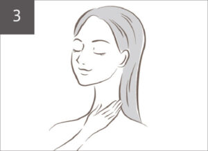 3. 年齢を感じやすい首やデコルテ周りは、首全面の中央から後ろへ、全体になじませましょう。